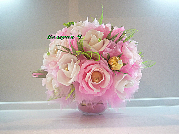 прикольно так получилось!!!мне нравится!и правильно , что в стекло, корзинка бы смотрелась грубо. а что сыпала в вазу, цветной песок???
