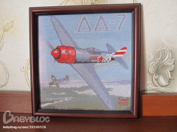 Наконец-то я его дошила! Этот самолет предназначен в подарок моему куму. Вышивала я его 3 месяца, по ночам (хотя он и небольшой, но с моим сынулей вышивать быстро затруднительно)) Схему делала сама в РМ из подходящей картинки. Вроде отшив получился неплохой) Сфотографировала немного сбоку, т.к. если фотографировать прямо, то стекло бликует.
