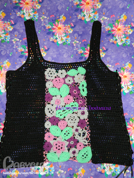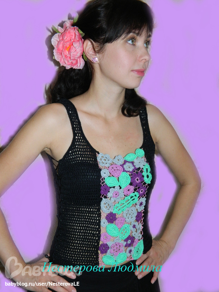 на размер 42, пока нет фото на модели,очень за это извиняюсь(сама люблю рассматривать когда всё во всей красе :-)) , придумала сама. Я пока тренируюсь в этой технике вязать, начала с небольших вещей.