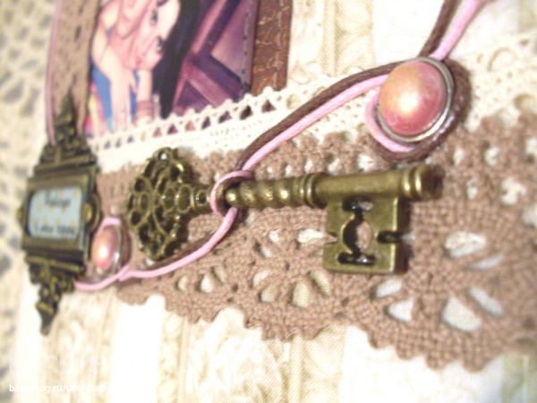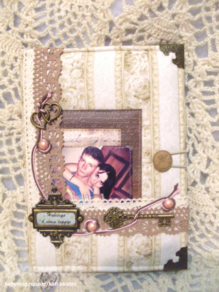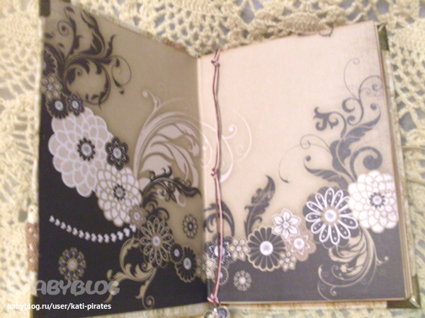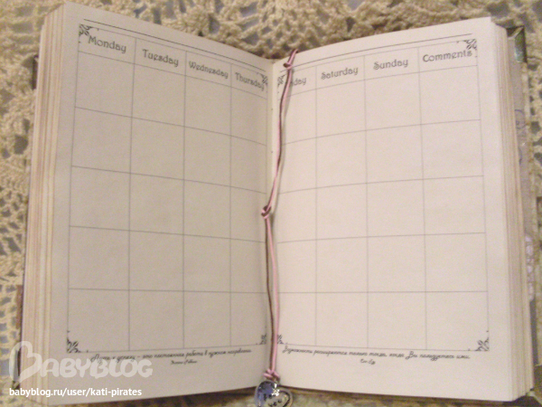 СкрапбукингФормат А5. Обложка мягкая, обтянута японским хлопком. Внтри 100 состаренных страничек, 80 из них пролинованны под планинг: дни колонски с днями неделями на английском языке + колонка длякоментариев, под табличками жизнеутверждающие фразы философов и 20 страничек просто чистых. Закладка - вощенный шнур с "лунным камнем". Закрывается резинкой на пуговку.