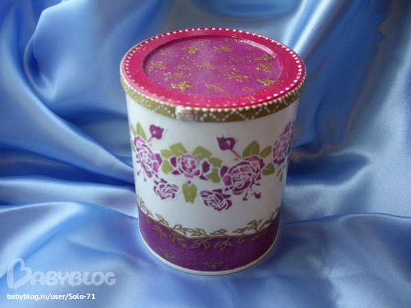 ой как я вас понимаю и наверно ещё многие))) бывает что так хочется доделать поделку, полюбоваться результатом, но вот что-нибудь раз и не идёт, я теперь в таких случаях просто откладываю работу , занимаюсь чем нибудь другим (не рукоделием), нужно просто отвлечься на какое -то время, а потом всё как по маслу пойдёт. А тарелочка мне понравилась очень, фон замечательный, да и баночка в целом хорошо получилась, а с пластмассой я тоже не "дружу", вроде и наждачкой её трёшь и обезжириваешь, а акрил ползёт. так что не отчаиваемся и творим дальше)))  Удачи!!!