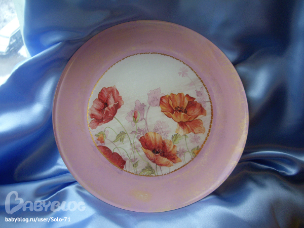 Да я отложить не могла - я хотела эту тарелку в подарок сделать (соседке, она нас очень выручает когда надо дочу на часок оставить), но хотелось что бы вещью можно было пользоваться, а не просто так как пылесборник стояла, но ТАКОЕ дарить точно нельзя, вот сижу делаю другую, но уже с прямым декупажем (еще одной стеклянной тарелочки нет).