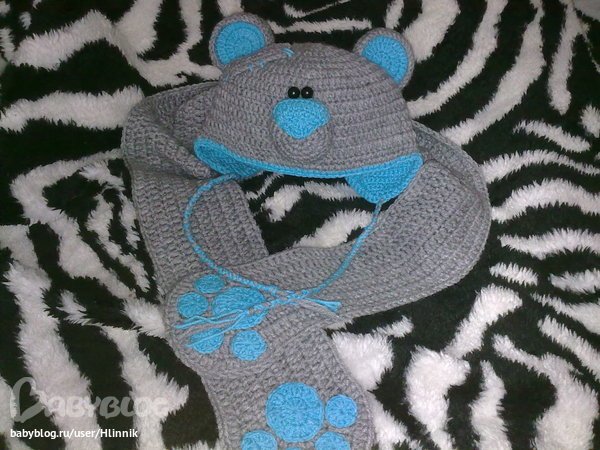 Спасибо! Вообще вязала без схем, ориентировалась на фото, собирательный образ так сказать! Просто связала шапку столбиками с накидом,(2 слой столбикми без накида синими нитками)  ушки двойные(сзади серые, спереди синие-2 круга соеденные между сабой, вязанные тоже столбиками с накидом), носик(вязала до нужного диаметра с прибавлениями-потом пару рядов без ,до нужного мне размера(внутри набит нитками) -вязала столбиками без накида,+связала треугольник нужного размера синими нитками заплатка(столбиками без накида связала прямоугольник, и типа пришила стежками синих ниток) глаза-бусинки шарфик -шарф связан по кругу столбиками с накидом там где пошире(лапки)столбиками с 2 накидами а подушки лапок -круги разного диаметра, пришитые нитками