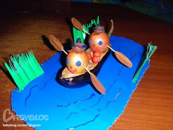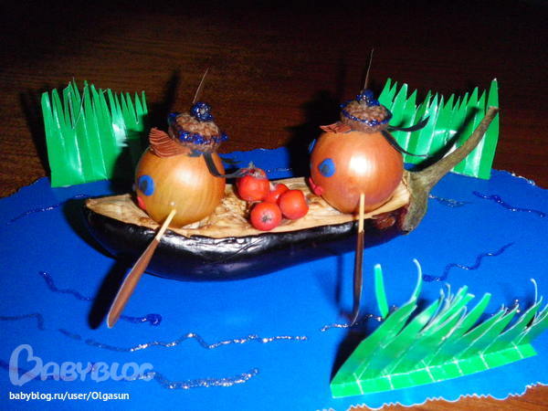 Поделки с детками.В садик нужно было сделать поделку из природных материалов на "Праздник Осени". Сыночек любит плавать, решили делать лодку))) из баклажана))), весла сам клеил, волны рисовал, пластилиновые улылочки делал, луковички выбираль, крышечки от жолудей собирал и рябяну (в лодке везут яблоки)))) - старался во всю. Домой сделали из тех же материалов, но по-больше))) Идея с лодкой не моя взята с просторов инета.