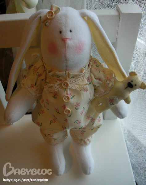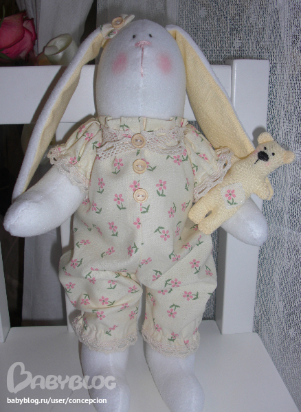 очень красивая малышка! прям такая девочка - девочка! мне тоже так зайку сшить хочется, уже и флис беленький лежит, а руки все недойдут никак)