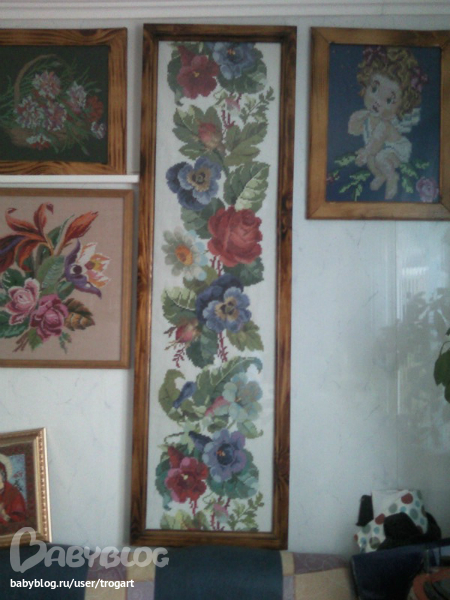 Моя работа связана с людьми. Я - почтальон! Придя выплачивать пенсию к одной женьщине, я была - ПРИЯТНО УДИВЛЕНА! Вся стена в вышитых картинах. Я попросила ее сфотографировать - она разрешила выложить в инет!. с ее разрешения представляю эти замечательные вышитые работы: