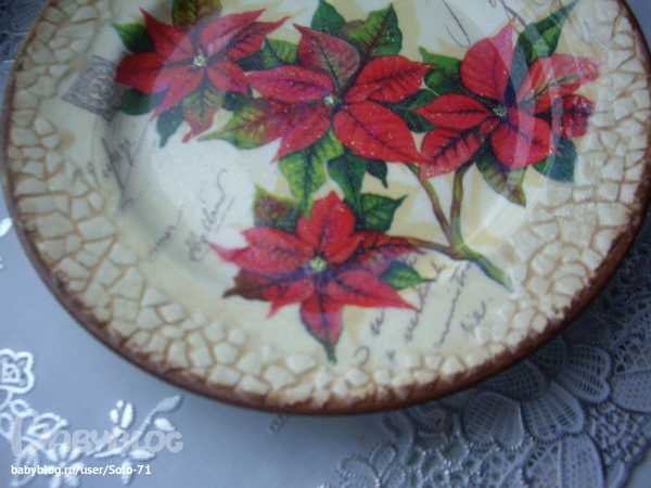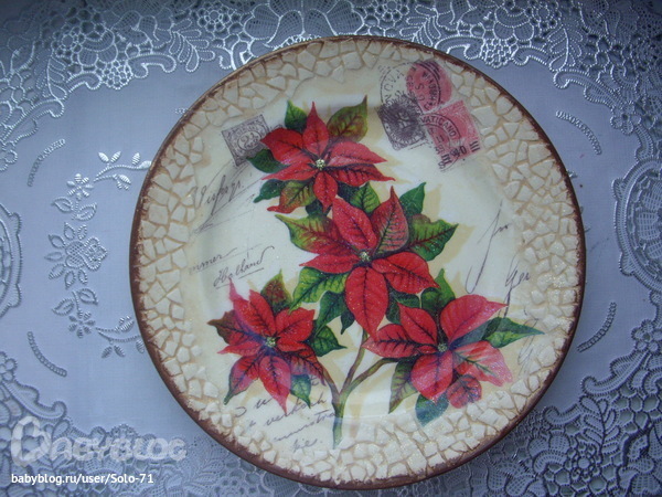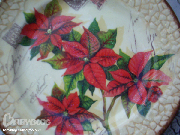 На фото еще толком лак не просох, а на "финише" я покрыла тарелку алкидным лаком-спреем, он убрал глянец и тарелка получилась как керамика и так мне даже еще больше стала нравиться.