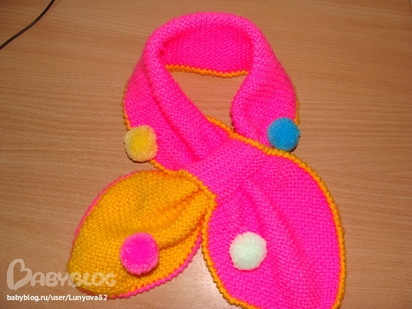Я связала для дочки шарфик-хомутик спицами.У нас было пять помпончиков-пятый сзади-беленький.Но как бы туго я не пыталась ввязать помпоны,дочка их всё равно вытягивает,поэтому совет такой:срезать их с пряжи,а потом в нужных местах просто привязать покрепче,узелка совсем не видно,я последний только так сделала.Может при вязании крючком будет потуже?!