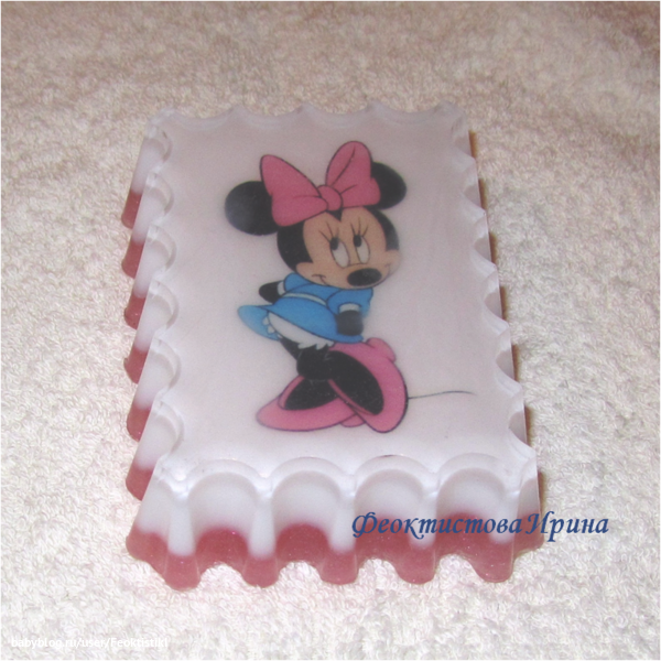 Это мыло я сделала для своей лучшей подруге. Мыло со скромной и смущённой, но очень милой Минни Маус, аромат "Вишня в шоколаде"
