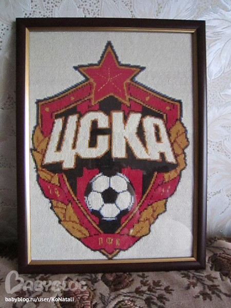 А мне очень нравится! Для первой работы масштабно и очень аккуратно! Следующую вышивку нужно начинать с середины, тогда и проблем не будет :) а ЦСКА - это наш семейный любимый клуб! :)