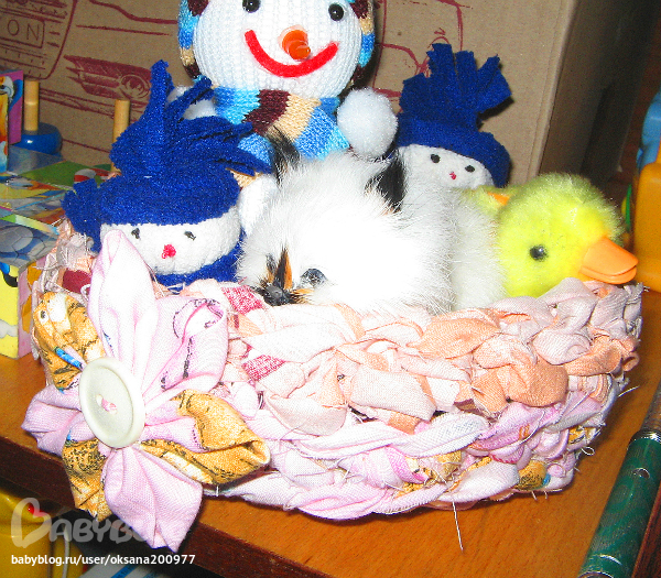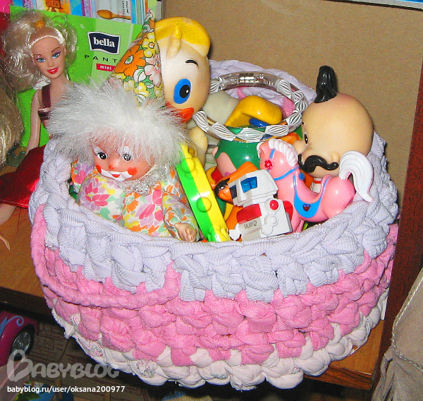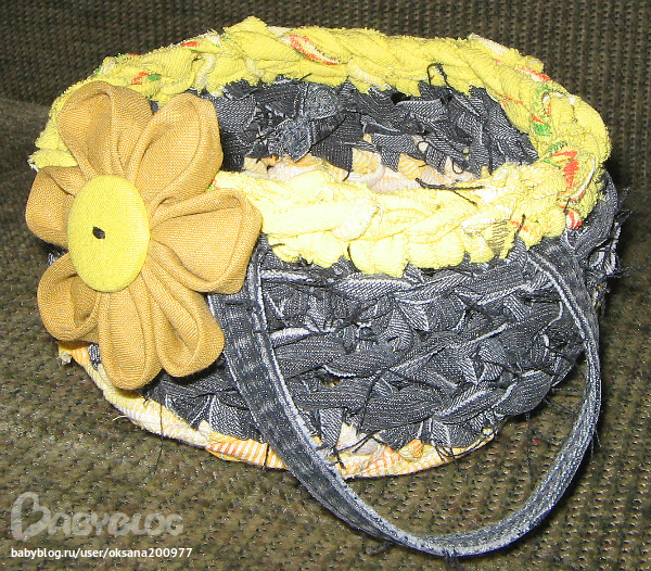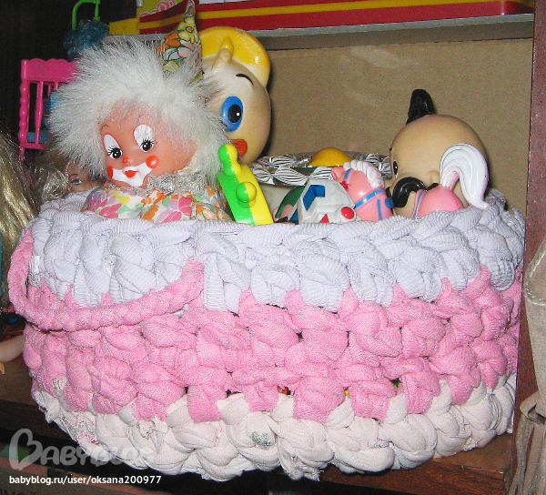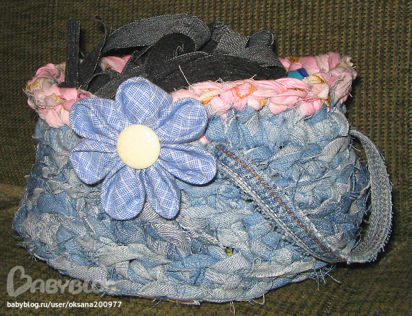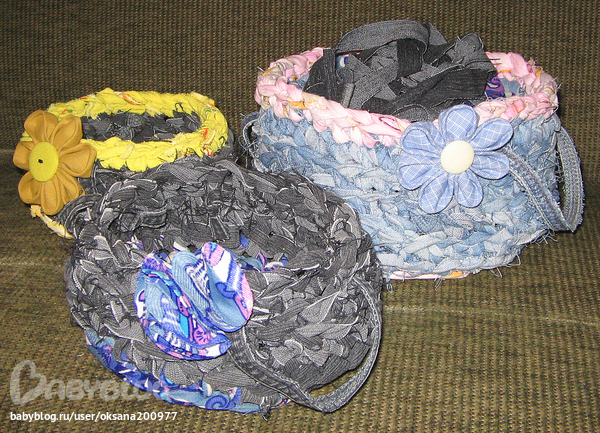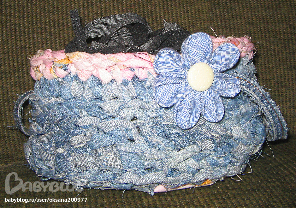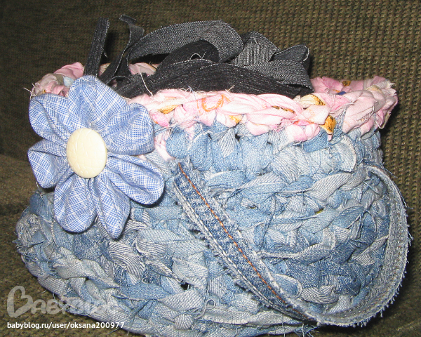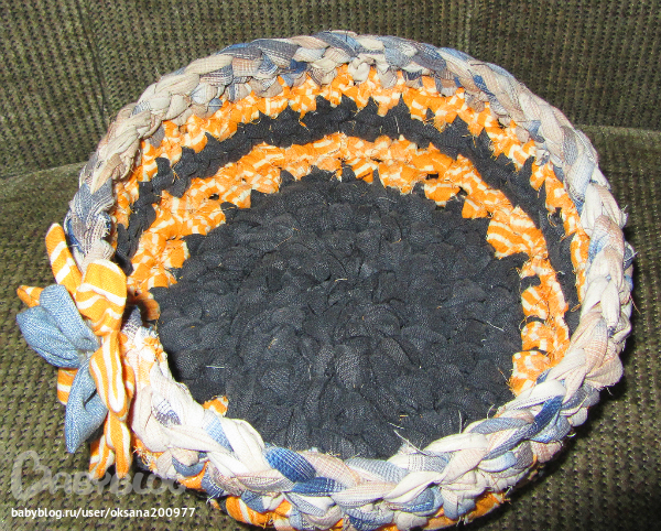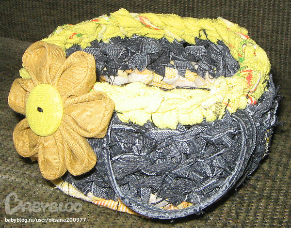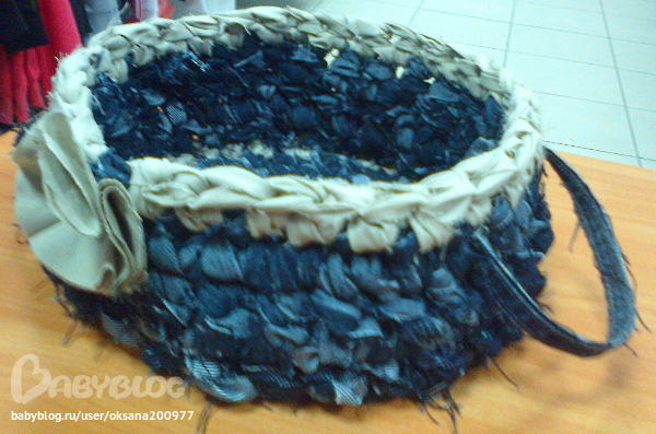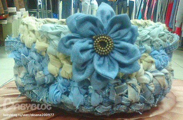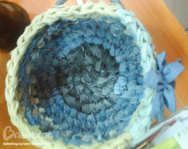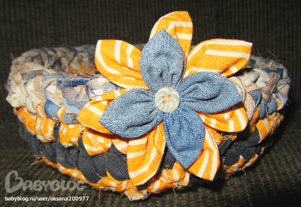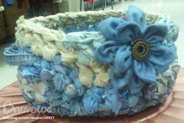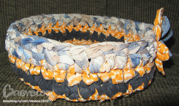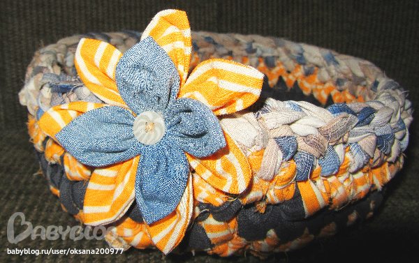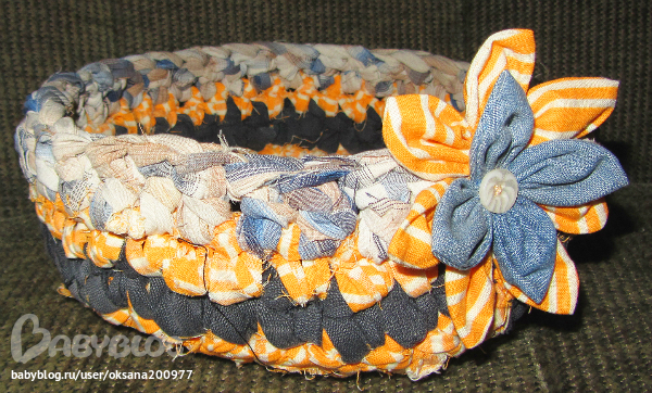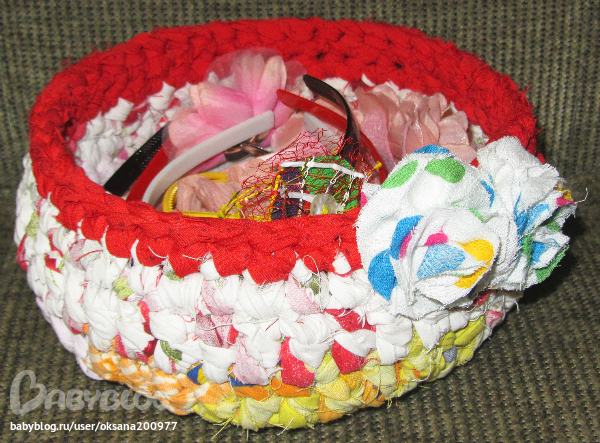 Спасибо! Все очень просто. Как раньше наши бабушки вязали коврики. Режем ненужные вещи (лучше джинсы или плотную ткань) на полосочки, сшиваем полосочки, чтобы получить одну длинную полосу и начинаем вязать крючком по кругу, это получается дно корзинки. Стенки корзинки вяжем столбик с накидом, для высоты. Затем можно вязать без накида, как вам больше нравится. Украшаем цветком. Как делать цветки смотрела МК в интернете. В ход идут все ненужные ткани, чаще всего которые идут на выброс. Розовая корзинка у меня из трикотажа, красная из х/б и джинса.