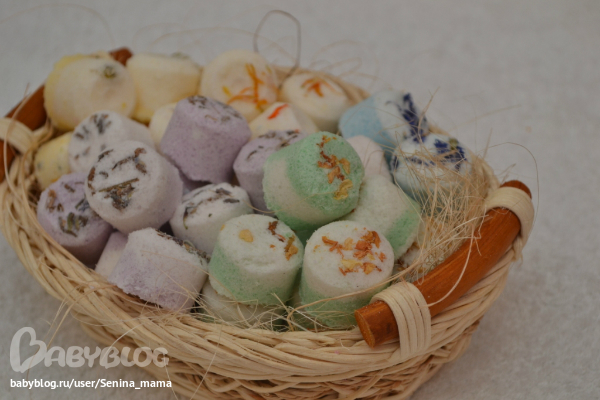 Содержат в своем составе разные ухаживающие масла, морскую и английскую соль, сухое молоко, мед и сухие цветки и лепестки.