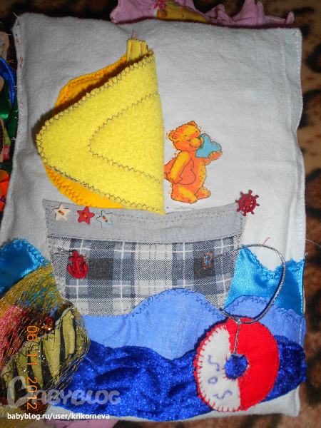 кораблик вобщем, за парусом мишка спрятался, в сеть можно сложить рыбок, драгоценности и все прочее..., якорь и круг перетягиваются.