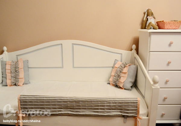 Так я решила зачехлить стандартный икеевский бортик. По бокам завязочки, внутри на липучках.