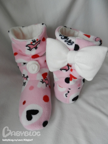 Сапожки из плотного флиса очень мягкого и приятного на ощупь.Декорированы объёмным бантом из флиса и розочкой.