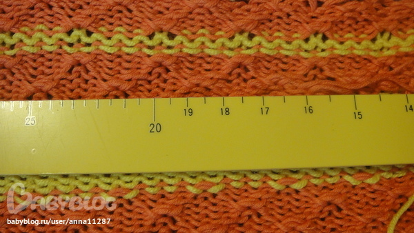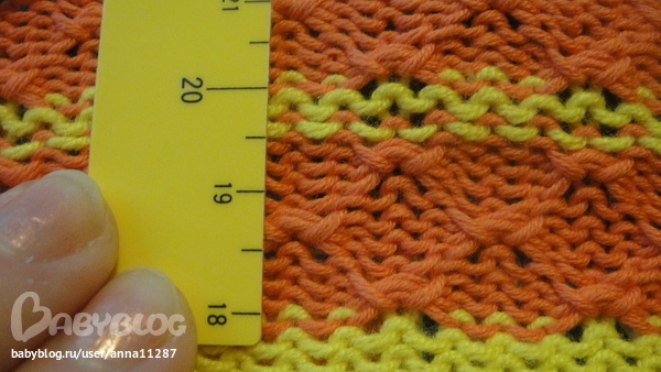 после заработка вяжется 10 рядов требуемым рисунком, затем 2-а ряда контрасной нитью сходной по толщене, далее 20 рядов рисунком, здесь отмечам контрасной нитью 21-ю правую и левую петлю и вяжем дальше еще 20 рядов, затем контрасной и снова 10 р. основной, закрепляем, снимаем с машины, даем отлежаться 4-е часа мимнимум !!!!, а лучше сутки! берем образец аккуратно расправляем, не тянем!!!, накалываем и отпариваем. делаем расчет.