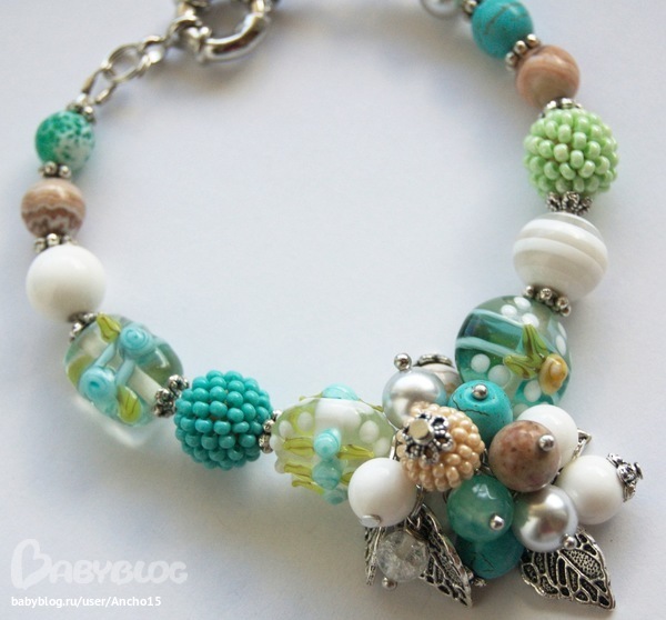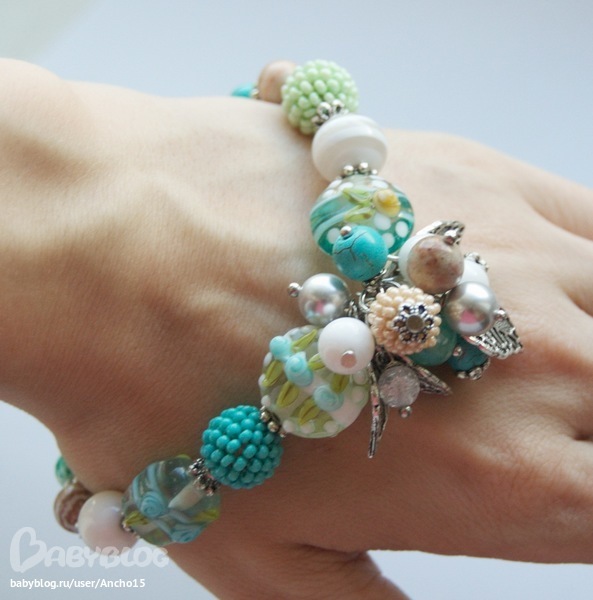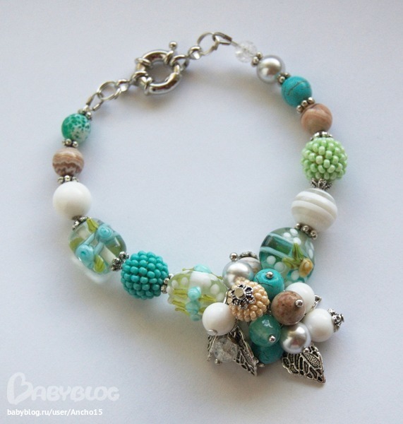 Браслет выполнен из бусин, оплетённых чешским бисером, бусин lampwork, яшмы, агата, бирюзы, акриловой бусины, жемчуга майорика, гранёного агата и фурнитуры под серебро.