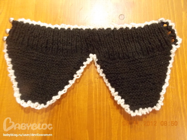Моя шестилетняя племянница попросила связать ей черную шапку с длинными ушами и почему-то обязательно белыми бомбошками.