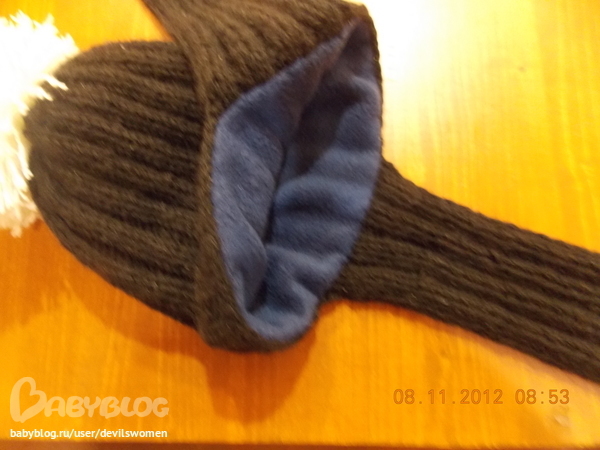 Шапка внутри утеплена флисом. Флис только не в цвет. Ну уж какой купили и принесли, тот и сделала. Вот что у меня получилось. Критика принимается.