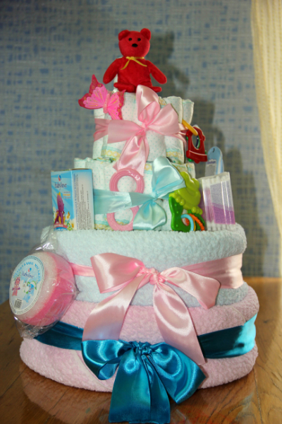 Тортик получился огромным, состоит из 4-х ярусов, на него у меня ушла большая упаковка подгузников – 94 штуки. Начинка следующая: два больших банных полотенца для манюни, три погремушки, серия по ухожу за кожей малыша – масло Babydream, средство для купания с головы до пяточек, крем под подгузник, детское мыло без отдушек и губка. Масло и средство для купания спрятались прямо внутри тортика, к ним еще присоединилась большая упаковка влажных салфеток. Также торт украшен парой носочков, термометром для воды, упаковкой ватных палочек с ограничителем, теркой для овощей и фруктов и маленьким мишкой.