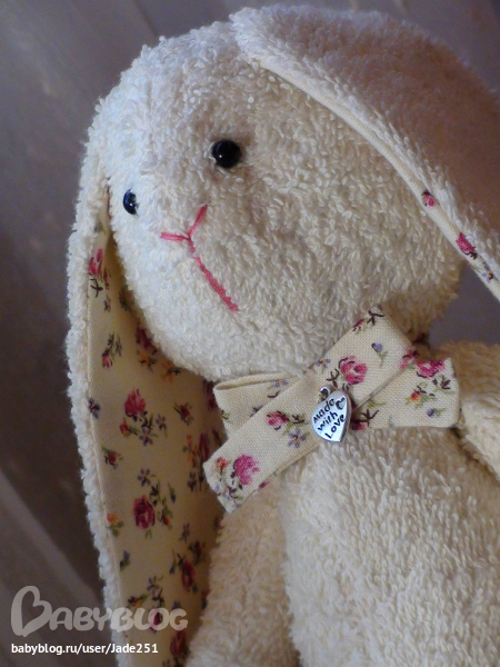 Росточком 25 см,сшит из мягкой махровой ткани,набит холофайбером,ручки и ножки на нитяном креплении,украшен бантиком и маленьким мет.сердечком.