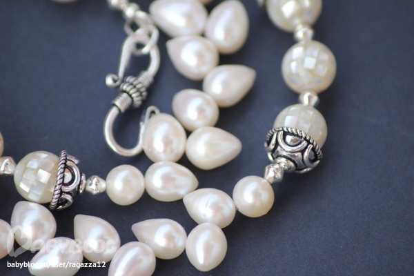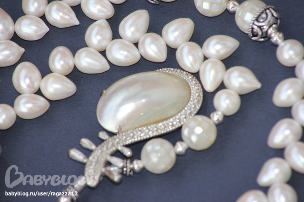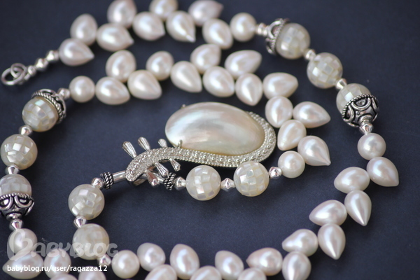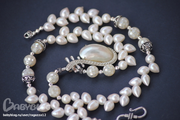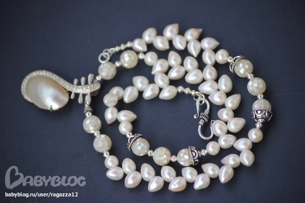 ) и у меня тоже БОЛЬШОЙ праздник.Сегодня я начинаю показывать украшения из полудрагоценных камней,серебра, позолоты.Это новый этап в моем творчестве.Уже несколько месяцев я подбираю камни ювелирной огранки,красивые бусины из серебра ручной работы и другую очень красивую,и что не маловажно ,КАЧЕСТВЕННУЮ, фурнитуру.Сейчас я покажу Вам колье из натурального,великолепного блеска жемчуга.Те,кто разбирается в жемчуге, поймут сколько труда мне стоило подобрать жемчужинки ( они одна к другой) .Подвеска ручной работы из перламутра и ювелирного сплава с покрытием серебром 925 пробы.В дополнение бусины из белого перламутра и фурнитура из меди с покрытием серебром 925 в стиле Бали.Единственный экземпляр (без повторов).