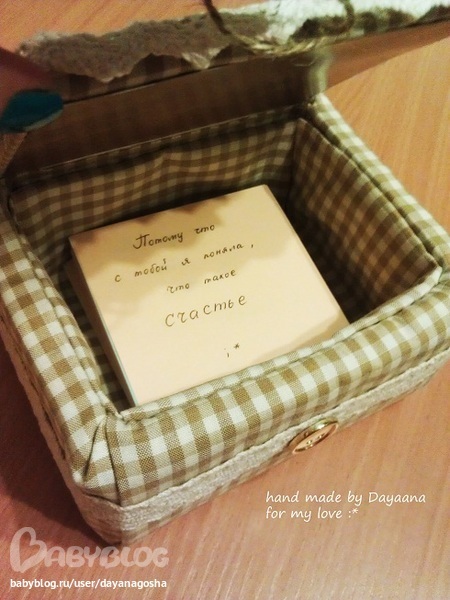 обтянула тканью коробочку от старого сотового телефона))) обшила углы и внутренность, декорировала кружевом. кстати он еще и мягкий, потому что коробку обклеила поролоном)