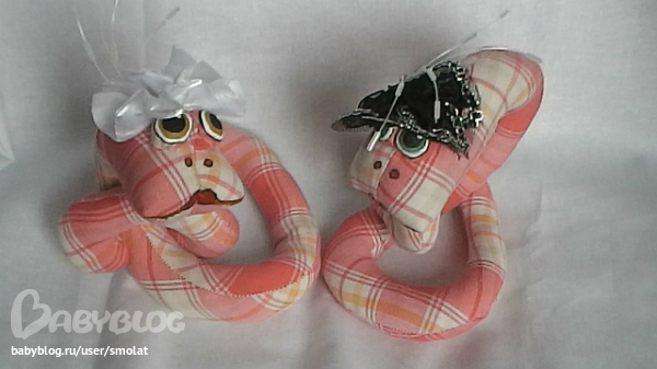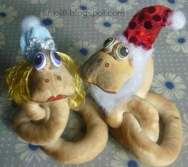 Как сшить такую змею, можно узнать из мастер-класса! Получились они довольно разные. Которая на 1 фото мне больше всех понравилась! Такая романтичная! А вот Дед мороз со Снегурочкой какие -то ужасные!