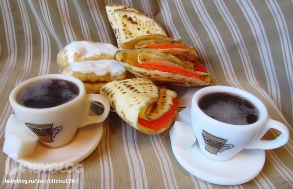 Чашки с ароматами Белый чай с имбирем и Жасмин. Блины некоторые медовые, некоторые горячий хлеб, эклеры - грильяж. А сахар - земляничный.