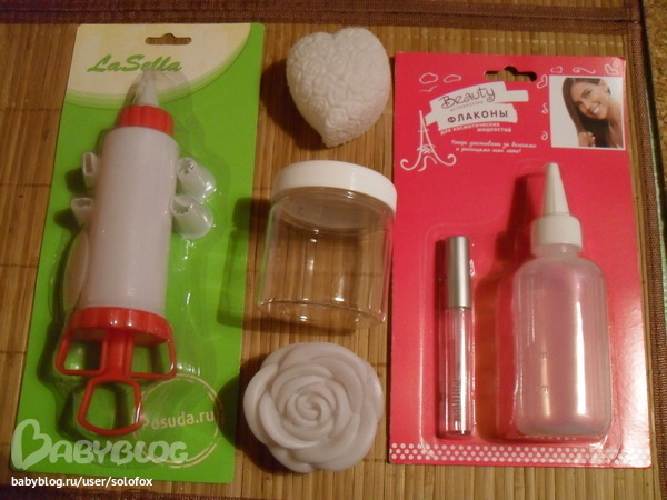 И флакончики, шприц для кремообразной основы. И моя гордость флакончик для туши(буду сама делать тушь), к сведению такой наборчик стоит всего 37р , в том же магазине по 37р купила сердечко и розочку для отливки силиконовой формы(буду делать такое мыло). Формочки очень красивые.