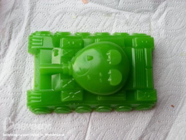 напишу как я делала - мк сейчас нет времени делать, сорри. порезала основу на кубики 1х1 см кухонным ножом на кухонной доске, потом в микроволновку на авто режим на 40 сек, если растопилось вынимать, помешала слегка чтобы пены не было, добавили аромат и краску, помешала и залила в форму, форму поставила сверху на кружку для чая, т.к. она сама по себе не стоит, дно фигурное и в морозилку остывать а пару часов. ус :) танк готов.