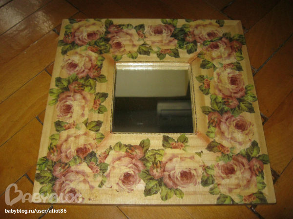 Вера я конечно не спец в декупаже - сама только учусь, но вот у вас видна 1 ошибка большая - вы зеркало не покрыли краской. так и рисунок ярче смотрится и защита лучше. я почему заметила - сама с этого мотива начинала))