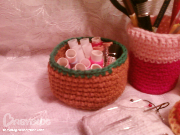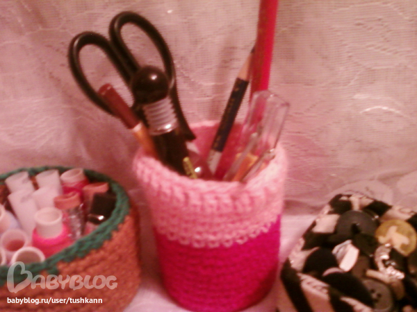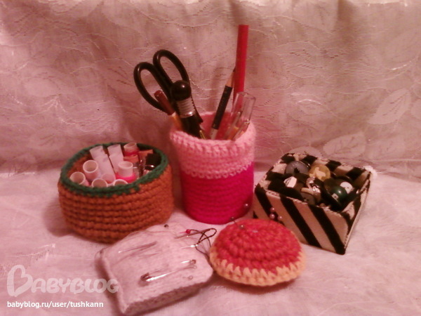 здесь две игольницы, которыми постоянно пользуюсь, мешочек для ниточек, коробочка под пуговицы и обвязанный стаканчик для всякого