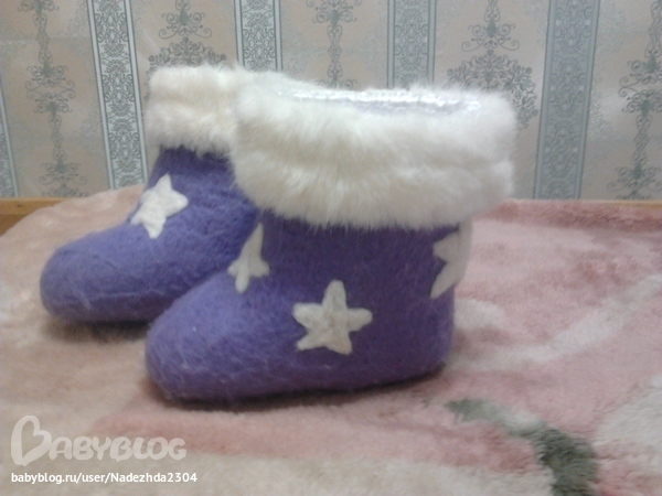 Валяла валяла и наконец сваляла. получилось 9 слоев шерсти. Все боялась что ножки будут мерзнуть. Да вроде нет... не мерзнут. Специально сразу после прогулки снимала их и трогала ножку, ножка теплая. Выставляю на ваш суд.