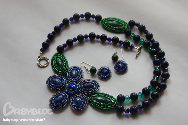 1. Комплект с лазуритами и малахитами. А также бисер Тохо, стеклянные бусины и риволи Сваровски. Этот комплект я подарила маме на День Рождения. Давно задумала ей этот подарок. И почему-то с самого начала остановилась на этих камнях. Наверное, потому, что мамины глаза часто меняют цвет от зеленого до сине-голубого в зависимости от настроения. Ей очень понравилось!