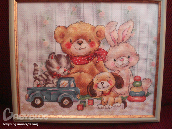 вышивка очень красивая,особенно мишка на прищепке.Но не понравилось оформление,видно,что сами оформляли,натяжка не идеальная,борит.