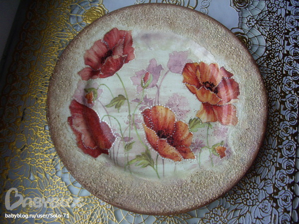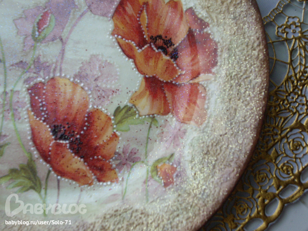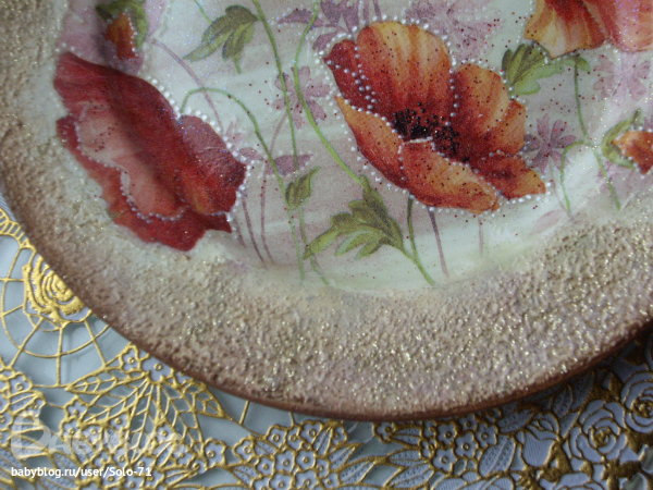 "Бусинки" вокруг цветочков это контур для создания жемчужин, рисунок это салфетка обыкновенная бумажная 3-х слойная приклееная на ПВА разведенный водой, а "шубка" по краю тарелки это шпаклевка (по дереву