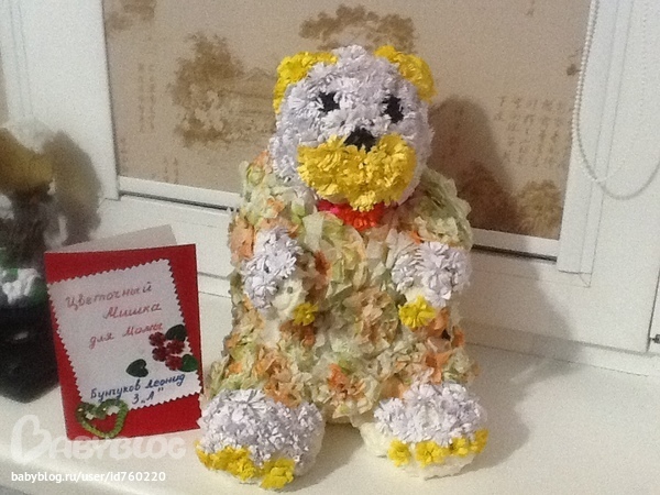 Мы долго всей семьёй думали. Потом из монтажной пены сделали каркас. подождали пока застынет. Ну цветочки начали втыкать. Сначала начали маленькими цветочками украшать, но часа через 3 поняли, что это надолго. Тогда я взяла салфетки. и туловище уже делали из больших цветочков. Сил было потрачено немало!