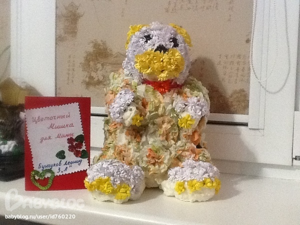 ух, сколько цветочков накрутили) замучались наверное.. я как то открытку с дочкой мастерила с такими цветами, думала с ума сойду)) а и3 чего сделан мишка? какой каркас?