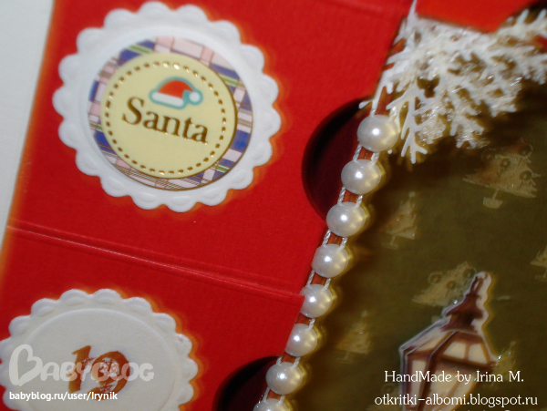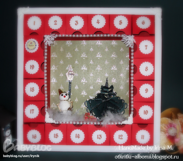 Сам календарь размером 30х30 см, сделан из плотного картона. Разделен по периметру на отсеки 5х5 см, в эти окошки и будет положена записочка с заданием. На 20 окошке 3-D надпись "Santa", которая символизирует приход Нового Года в этот день. В центре миниатюрка-панорамка.