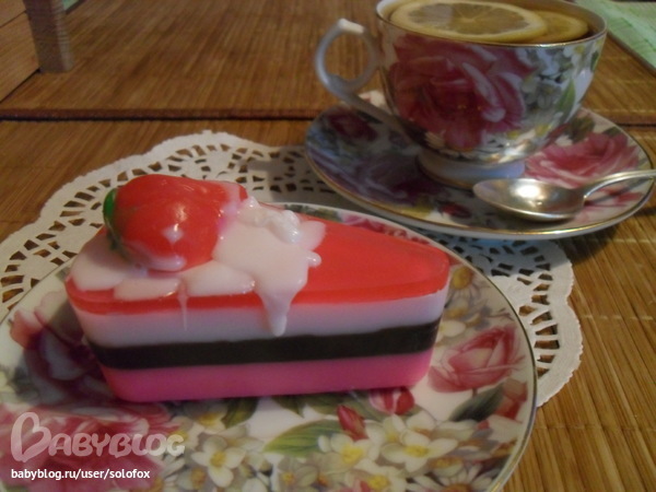 Слои надо спиртом пробрызгать и зубочисткой поцарапать, для сцепления перед заливкой каждого следующего слоя. Ягодки тоже сначала сами отливаются в отдельной формочке(я про запас делаю ягодки разные для украшения тортиков и пироженых, всегда пригодятся). Потом готовый кусочек тортика опрыскать сверху спиртом и налить белую основу не горячую, имитируя крем или взбитые сливки и сразу пока основа не застыла ягодки и всякие украшения слегка вплавляем, можно вместо ягодок сделать кусочки мыла как шоколад. Посмотрите в интернете картинки мыльные пироженые, мыльный торт, найдёте много разных вариантов для образца.
