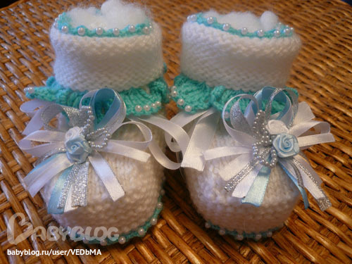 А для мальчиков как-то не заказывают. Я год назад вязала племянику немного клоунские пинетки с двумя рядами кружавчиков, но без бантиков.