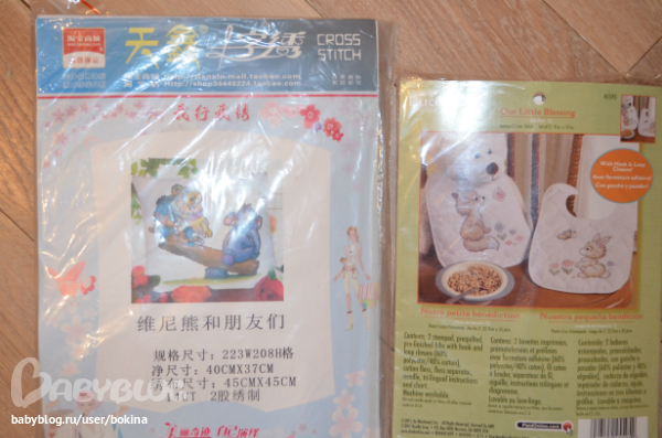 Наверное издержки вечерней съемки, один из наборов подушка с диснеевскими героями винни пуха, а второй наборчик из двух слюнявчиков.