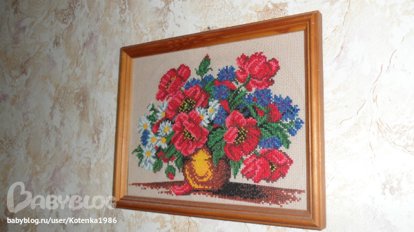 Сааамая первая работа - это цветы. Мама попросила ей вышить. Потом при очередном походе в магазин, я увидела вторую, очень понравилась (на рамку не обращайте внимания, вставили в какую была, но мне нравится )) ). Сейчас висит у свекрови. Еще одну вышивала (львица со львенком), а куда делась, не знаю (((