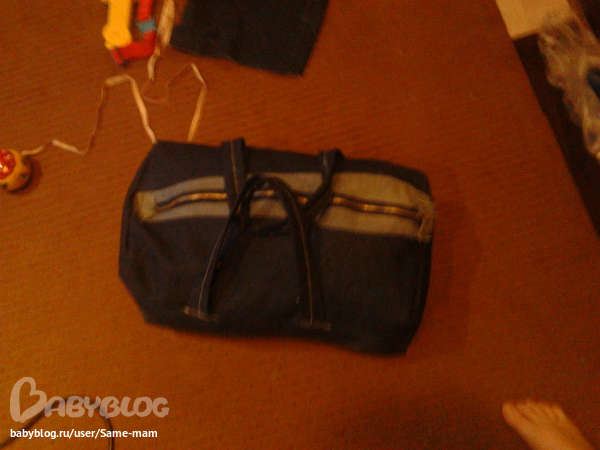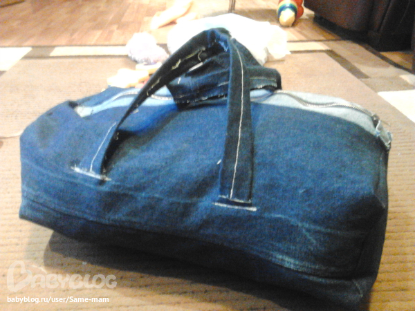 дома кроме нескольких пар старых джинсов ничего не было, а мне скоро предстоит ездить в спорт зал, а сумки нет... и вот решила попробовать!! поискала в интернете и поняла, что вроде бы не сложно и вот за 3 часа родилось вот такое косоватое чудо!! косоватое, т.к. нет нормальной линейки для закройки, и выкроек в общем тоже))) накосячила я конечно прилично, и если сумка выдержит хотя бы 3 похода в зал, это будет счастье))))