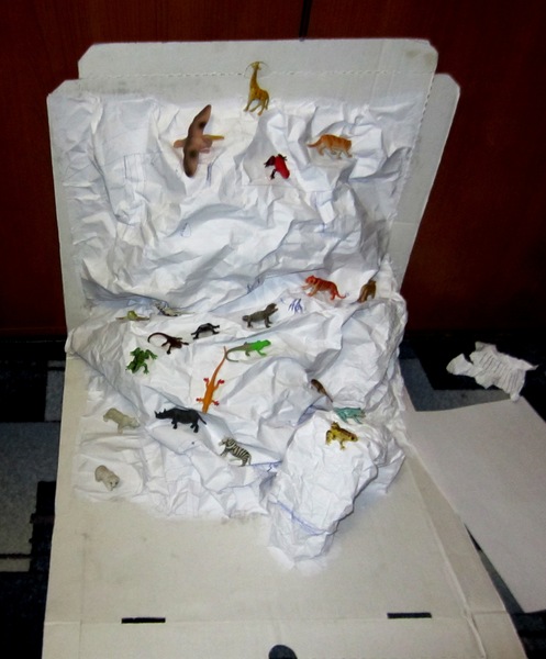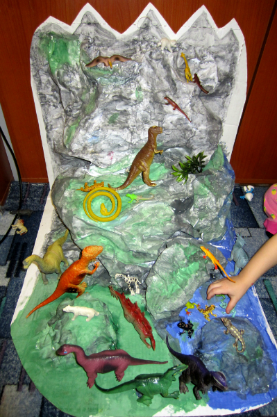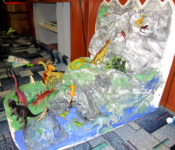 Поделки с детками.Сын хотел поиграть в парк юрского периода, замучил меня "Мама, купи мне набор лего, купи!" А одноимённый наборчик ст0ит ого-го! Пришлось вспоминать 2-й курс универа, макетирование. Склеилвали вместе с сыном. А потом и дочь подтянулась с кисточкой, так что раскрашивали они вдвоём. Краски, к сожалению, не хватило. Поэтому белые пятна будем закрашивать завтра. Из коробки от пиццы, клея и нескольких листов бумаги получилось вот это: