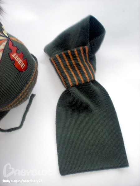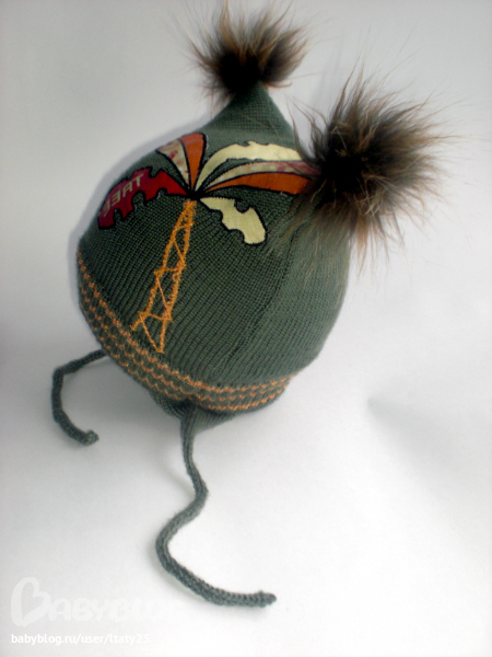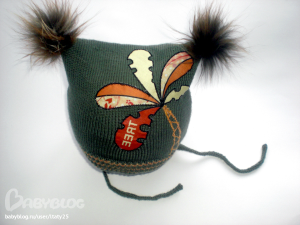 Шапочка связана прямоугольником, сверху нашила аппликаци и пришила ниточку пряжи (ствол) зигзагом. Внутри подклад флис.