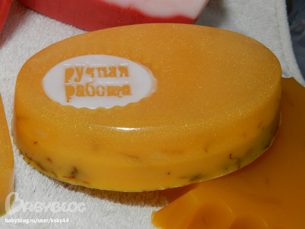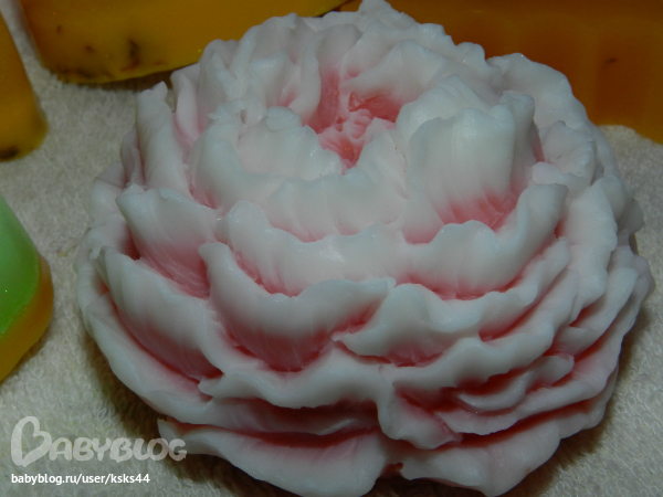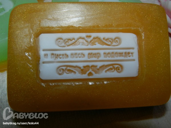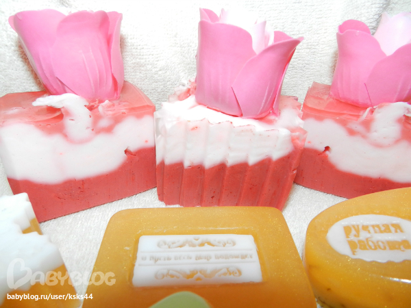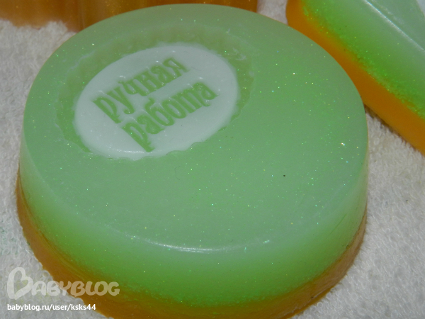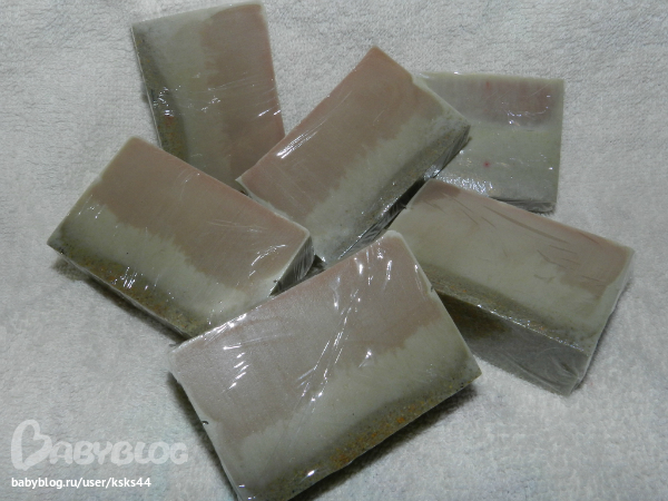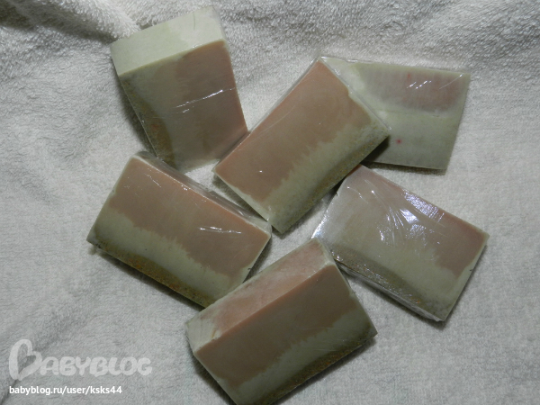 Это мыльце с розовой и зеленой глинами. Хотела сделать неравномерные переходы, но видимо смеси были горечеваты и почти смешались.((( Будем учиться.