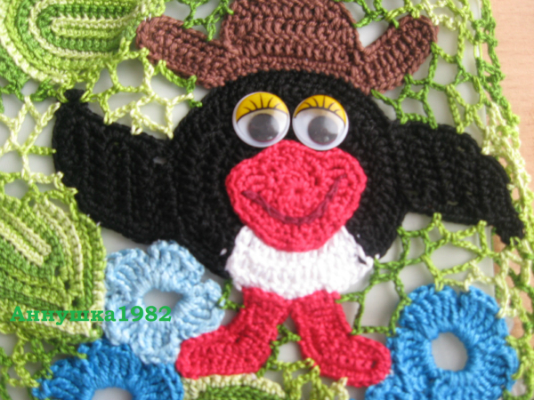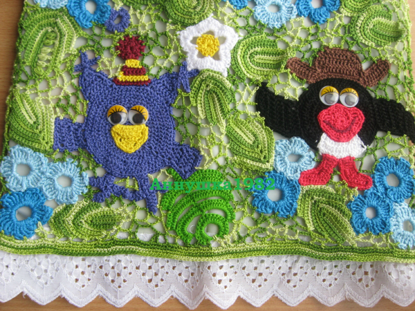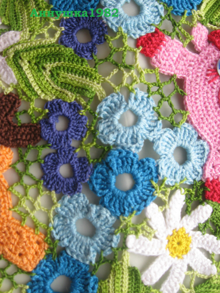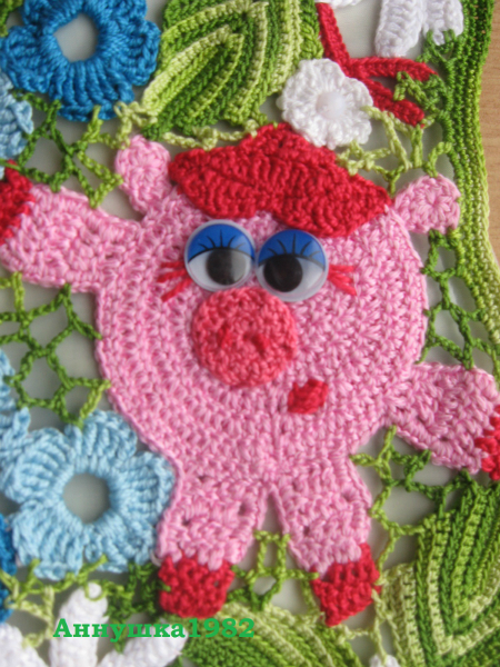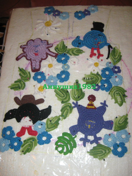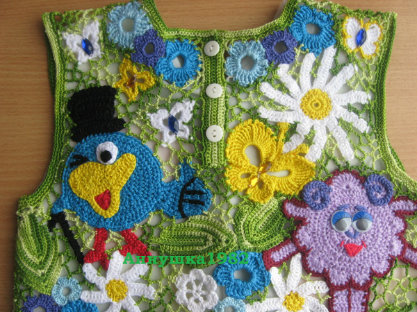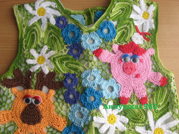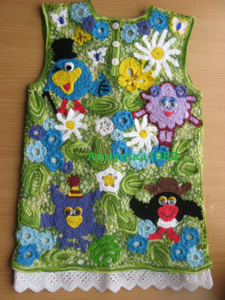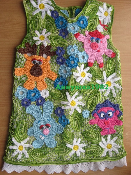 В начале года на просторах интернета увидела несколько вариантов сарафанов, маечек со смешариками, я тоже загорелась подобное связать. Вот, в принципе, что из этого вышло...