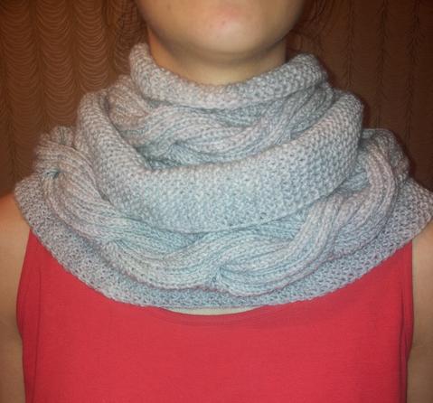 След.ряд с перехлестом: 10 п. платочной вязкой, отложить 12 п. на вспом.спицу за работу, *2 лиц.п., 2 изн.п.**, повторить *...** 3 раза, затем провязать петли со вспом.спицы *2 лиц.п., 2 изн.п.**, повторить *...** 3 раза, далее провязать 20 п. платочной вязкой.